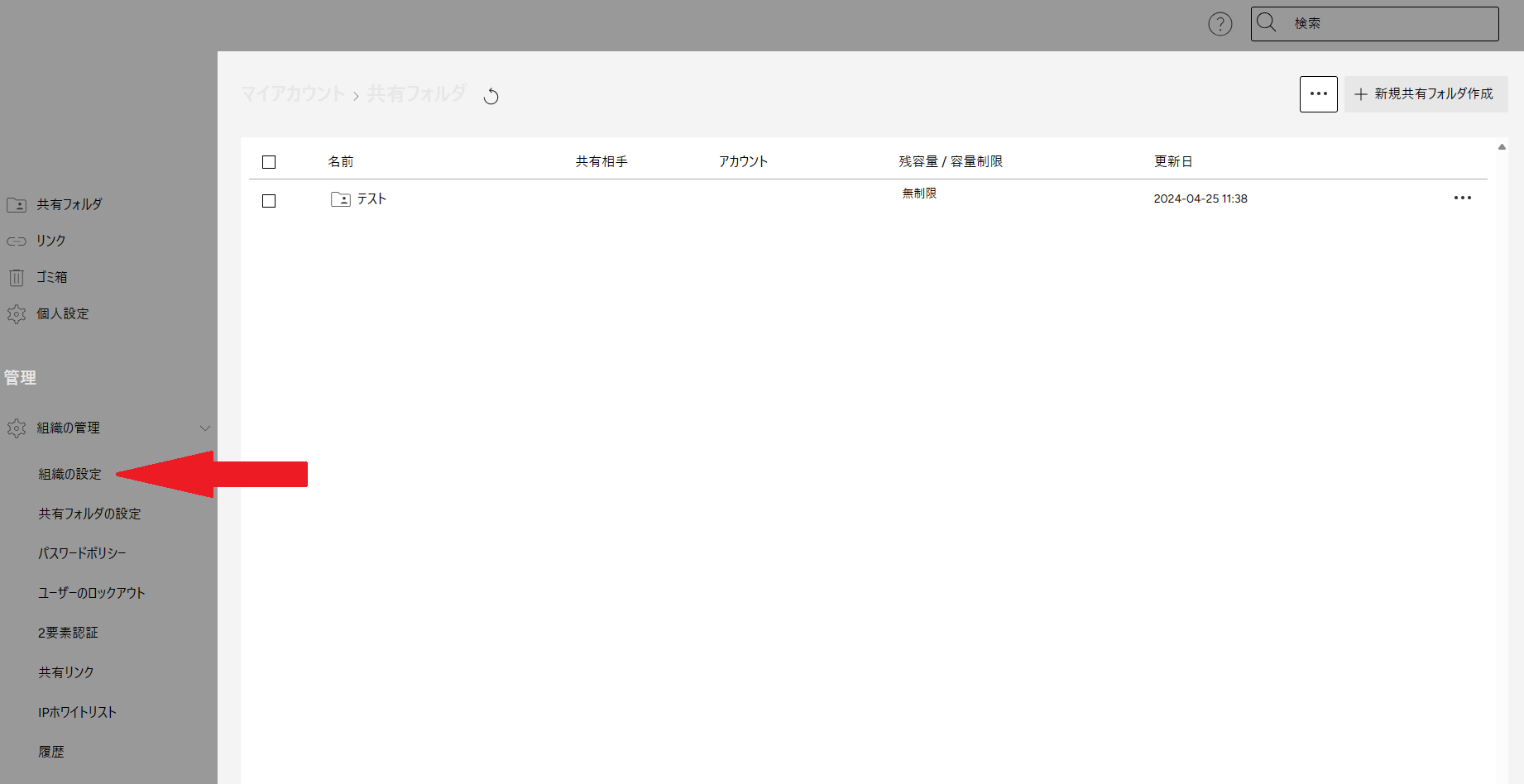 ログイン画面左の項目から、管理 > 組織の管理 > 組織の設定 を開きます。