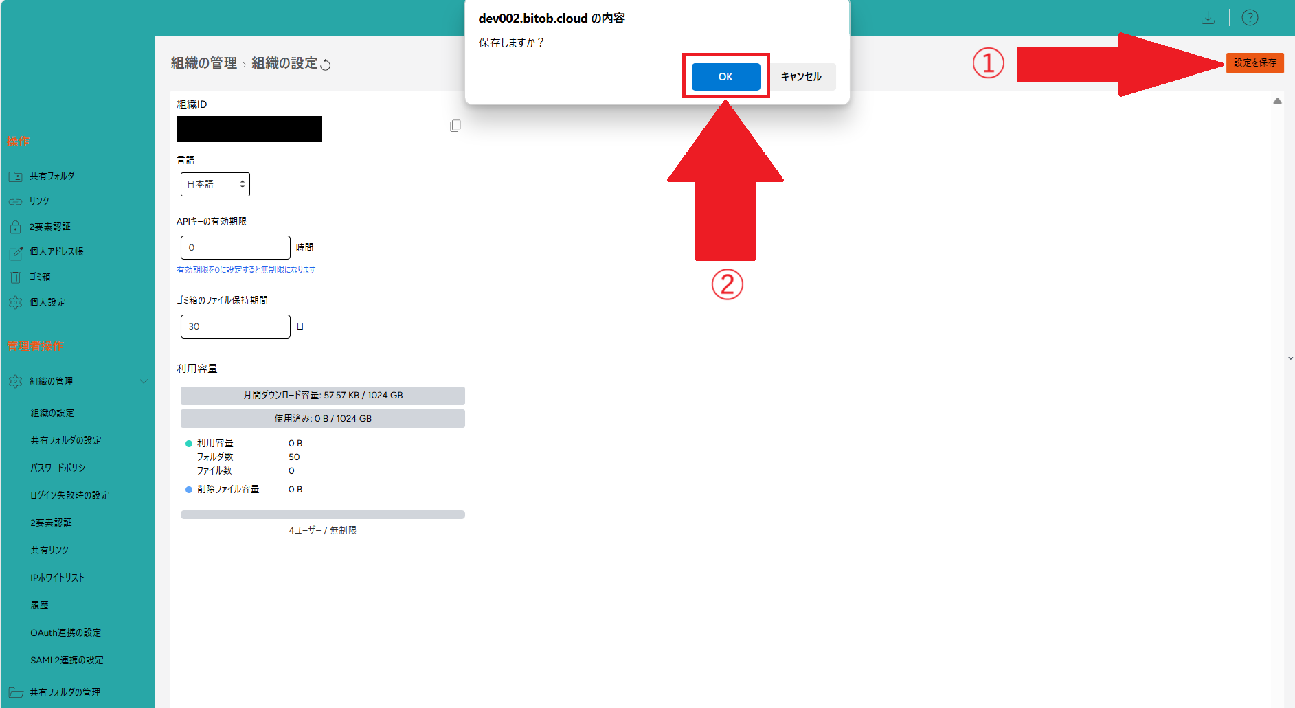 ログイン画面左の項目から、管理者操作 > 組織の管理 > 組織の設定 を開きます。