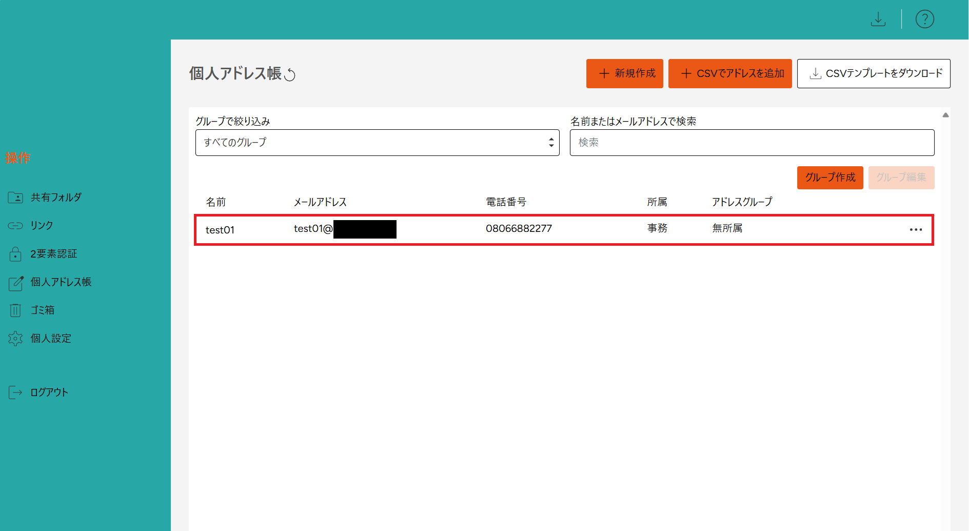情報が入力できたら、個人アドレス帳から[CSVでアドレスを追加]をクリックします。