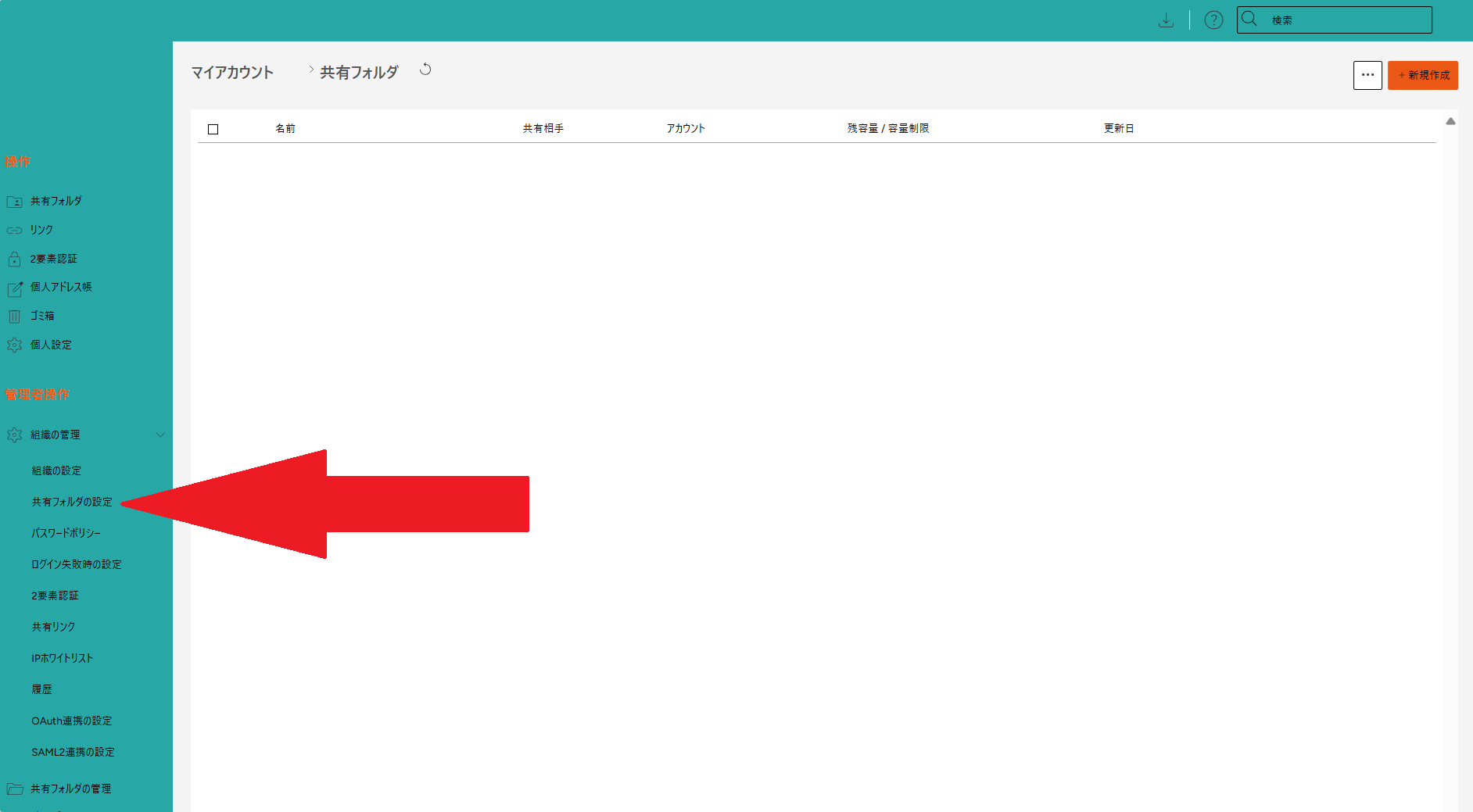 ログイン画面左の項目から、管理者操作 > 組織の管理 > 共有フォルダの設定 を開きます。