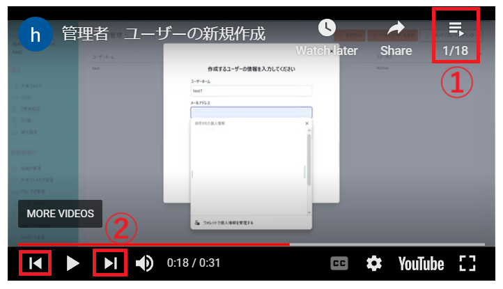 ①:再生リスト内の項目が表示され、見たい動画を見ることが出来ます。